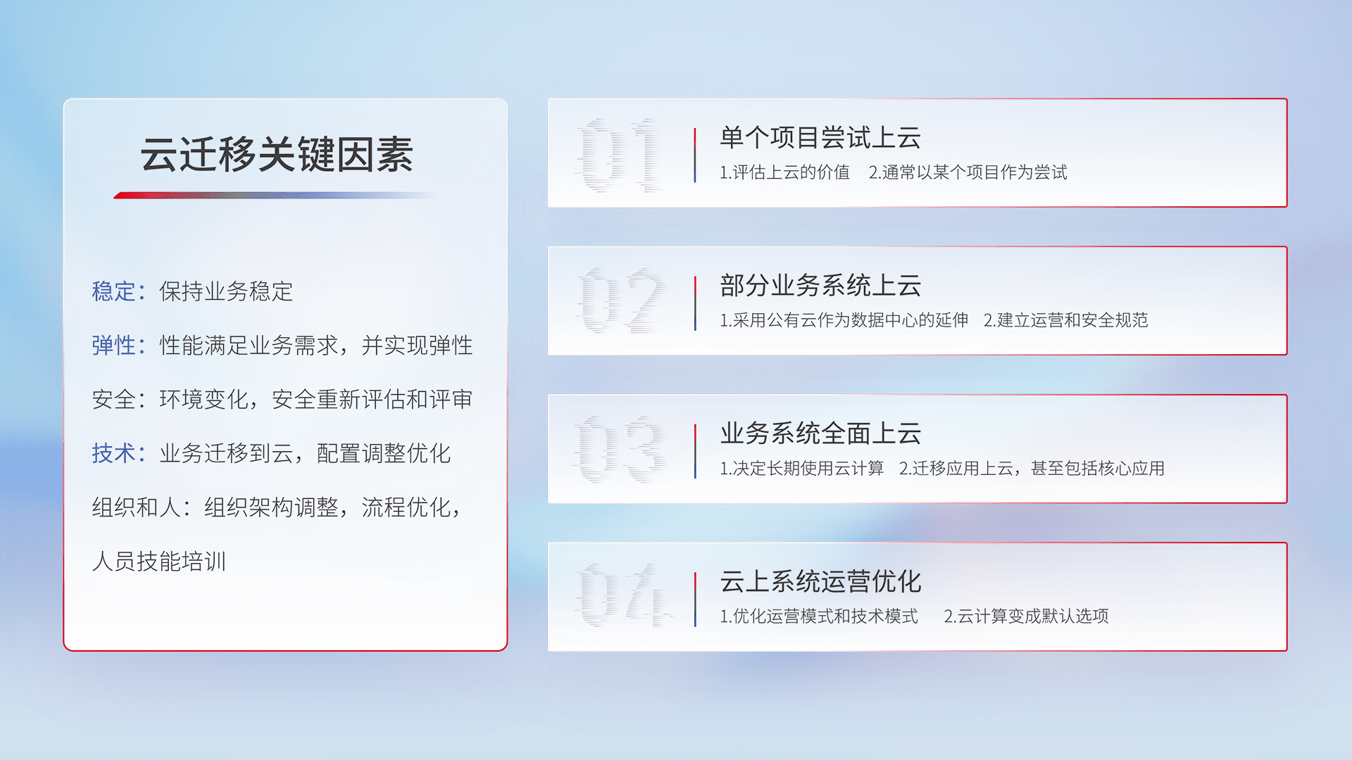 结合实际业务,,从规划设计、、云平台选型、、云原生改造、、、、数据迁移、、、、集成交付,,,迁移全过程为客户识别最佳上云路径,,,做好风险识别管理,,,设计网络架构、、身份权限、、、、安全审计合规、、操作审计、、、日志审计、、、、监控告警策略、、、、多站点容灾设计等,,,,对云上基础设施进行整体规划,,,,提升IT治理水平,,以满足弹性、、高可用、、高性能的需求。。