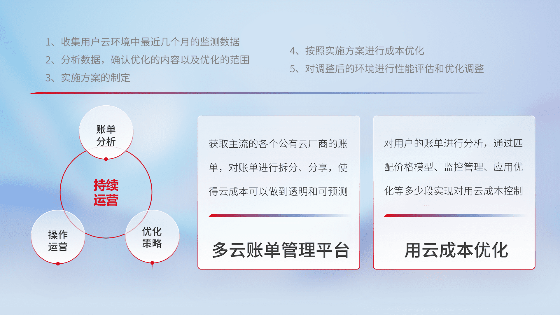 通过多云纳管,,,以统一的资源数据模型把客户的云资源进行抽象和封装,,,进而实现对多云资源的统一操作,,,保障云资源管理的可靠性、、、、稳定性与可用性。。量身定制化运维内容,,,,配置、、、、开发运维、、补丁管理、、备份、、监控、、、、认证和访问管理、、、审计和日常巡检等,,保障在用云过程中的可靠度,,,,稳定度以及高可用率。。。