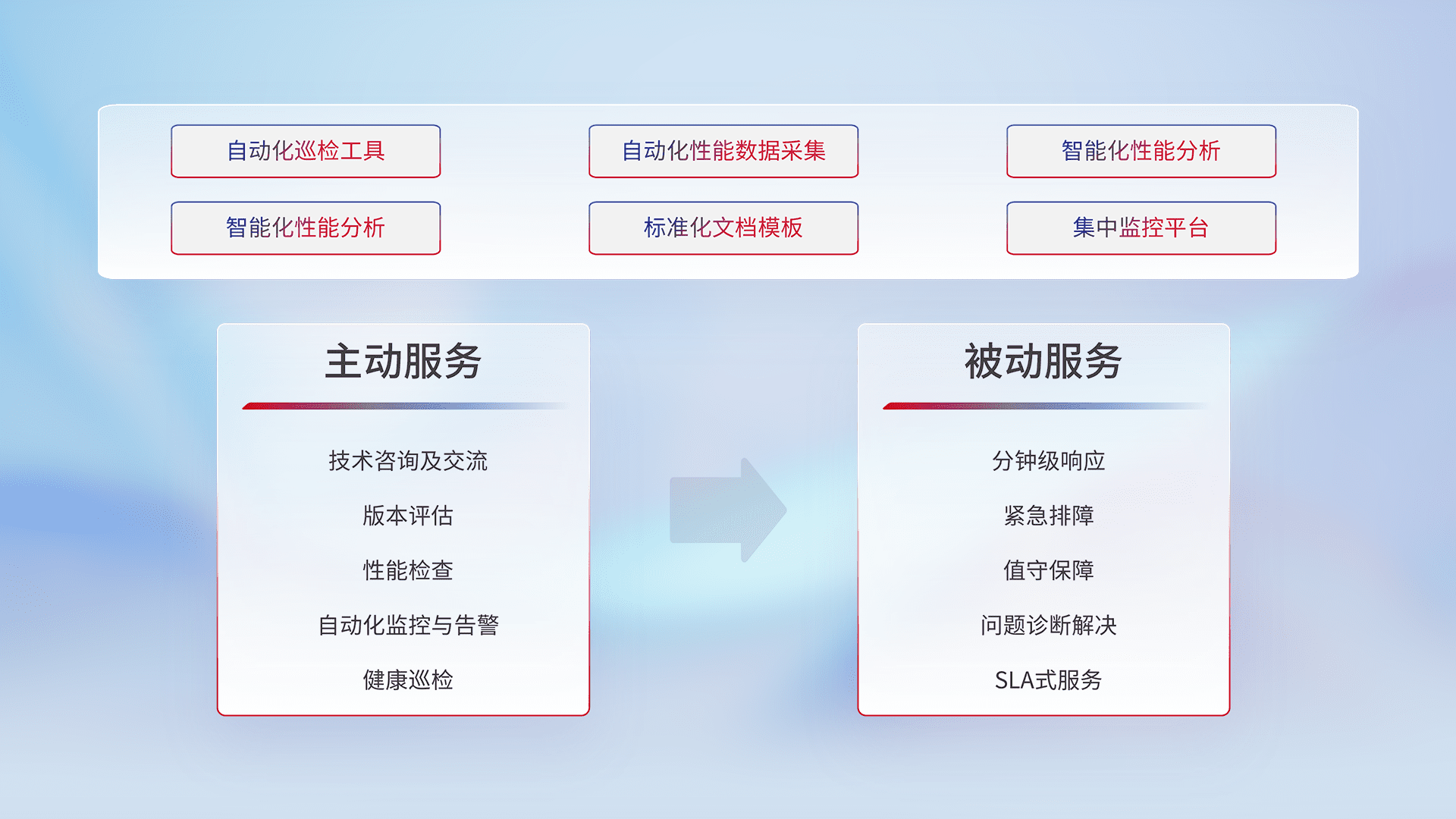 智能化工具和标准化文档,,保障服务质量,,,提供主动服务(包含技术咨询、、版本评估、、、、性能检查、、、、自动化监控与告警、、健康巡检)和被动服务包含(分钟级响应、、、、紧急排障、、值守保障、、、问题诊断解决、、、、SLA服务)。。
